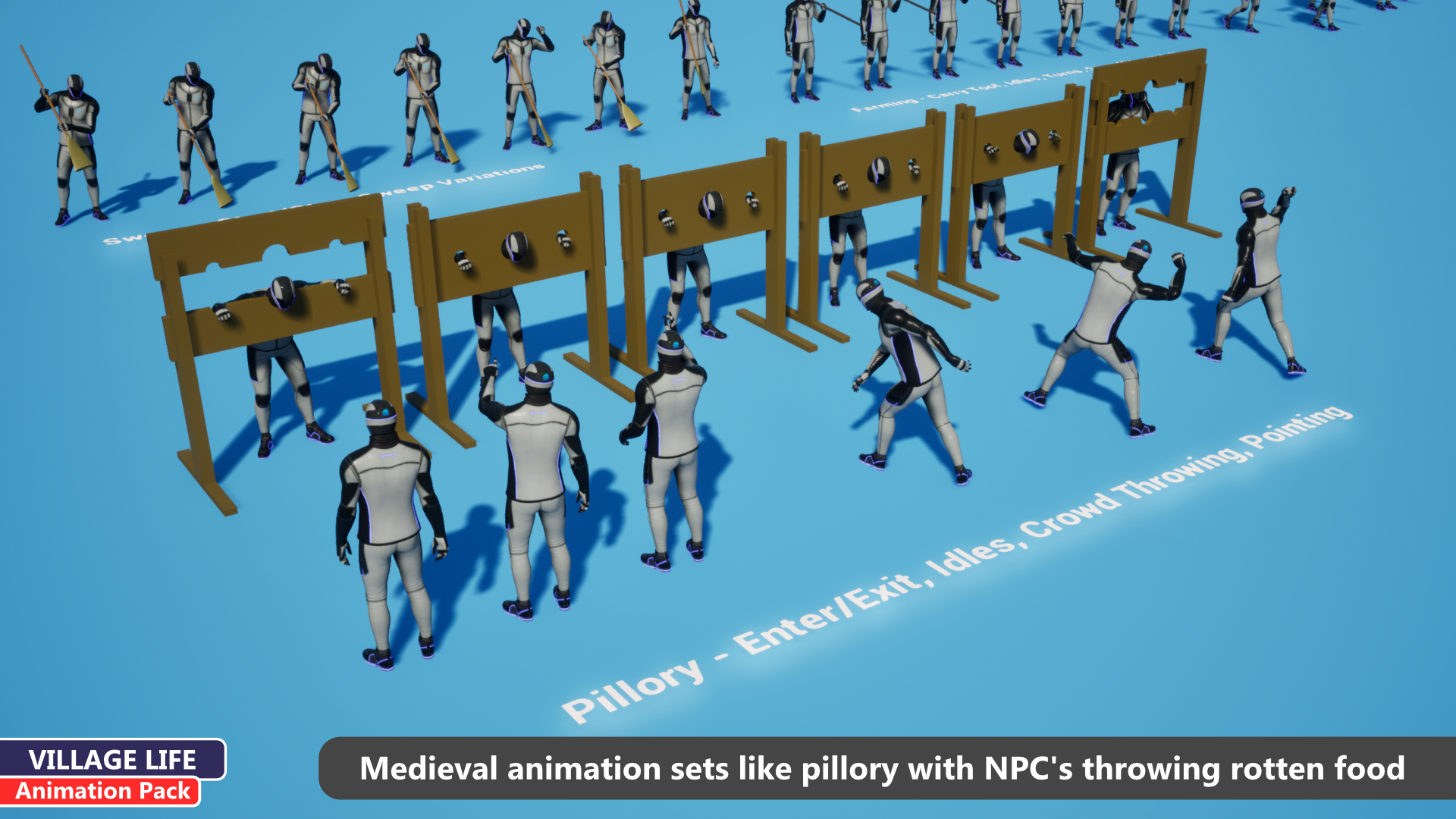 Perfect for open-world RPGs, survival sims, or strategy games, these animations cover the full spectrum of existence: hard labor, domestic chores, religious devotion, and even the gritty reality of medieval hygiene and punishment.