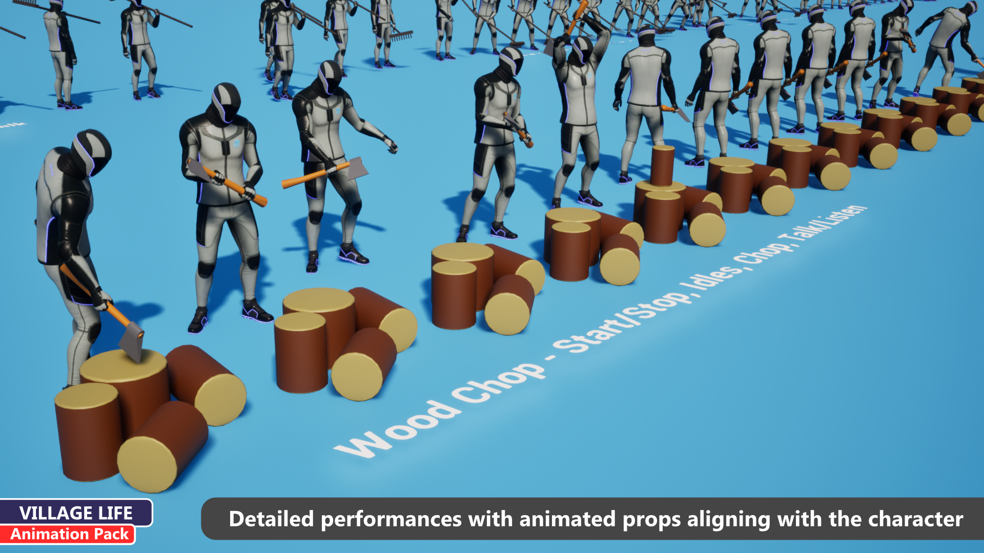 - Agriculture & Labor: A complete farming suite including using a scythe, hoe, and pitchfork, chopping wood, and feeding animals (bucket under arm) or throwing seeds.