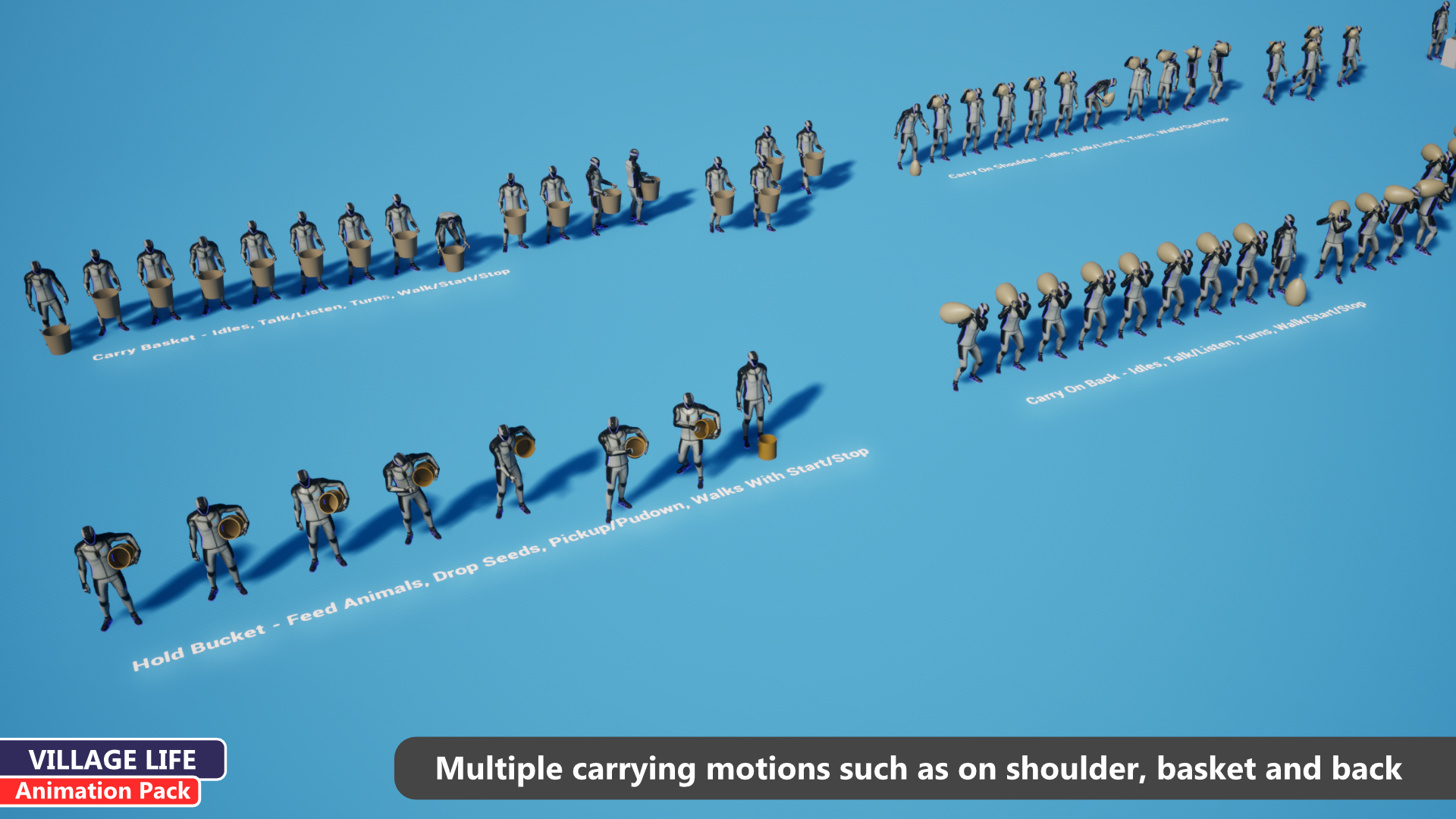 - Versatile Carrying System: Includes specific animation sets for carrying objects in five different ways (shoulder, back, basket, arms, and bucket), allowing for diverse NPC roles.