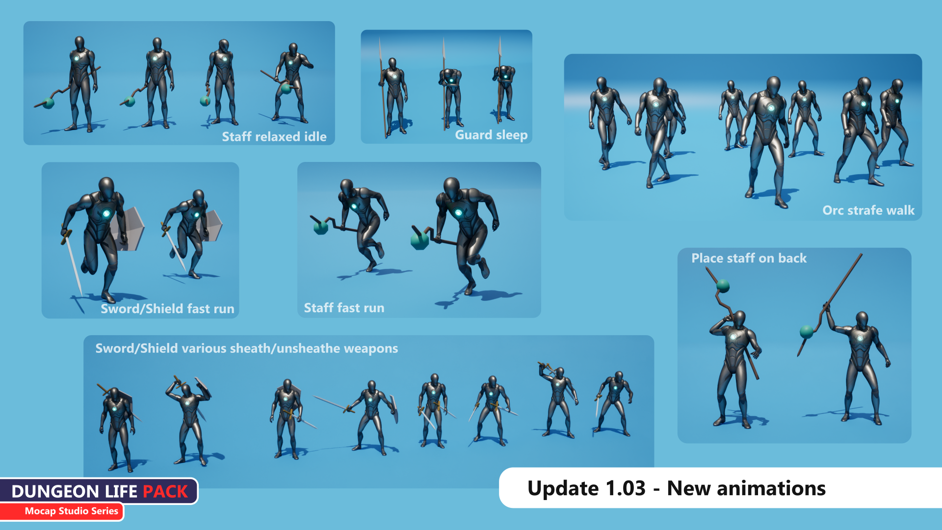 - v1.3 - New Anims - Run fast for Sword/Shield and Staff, Guard Spear sleep, Staff relaxed idle, Sword/Shield various sheath/unsheathe weapons, Staff sheath/unsheathe, Orc walk strafes. Hand weapons can now be attached to the weapon_r bone instead of using sockets. Updated undead turn in place anims so root is facing forward at the start.